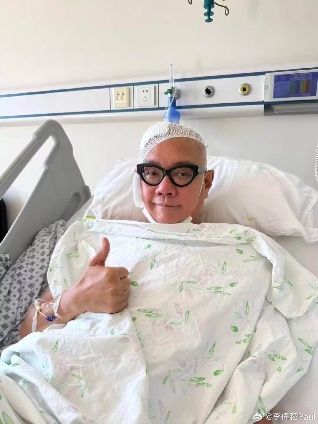 随微博消息发出的多张图片显示,病床上的李偲菘头发已剃光,且头上粘着胶布,显然已做了脑部手术。