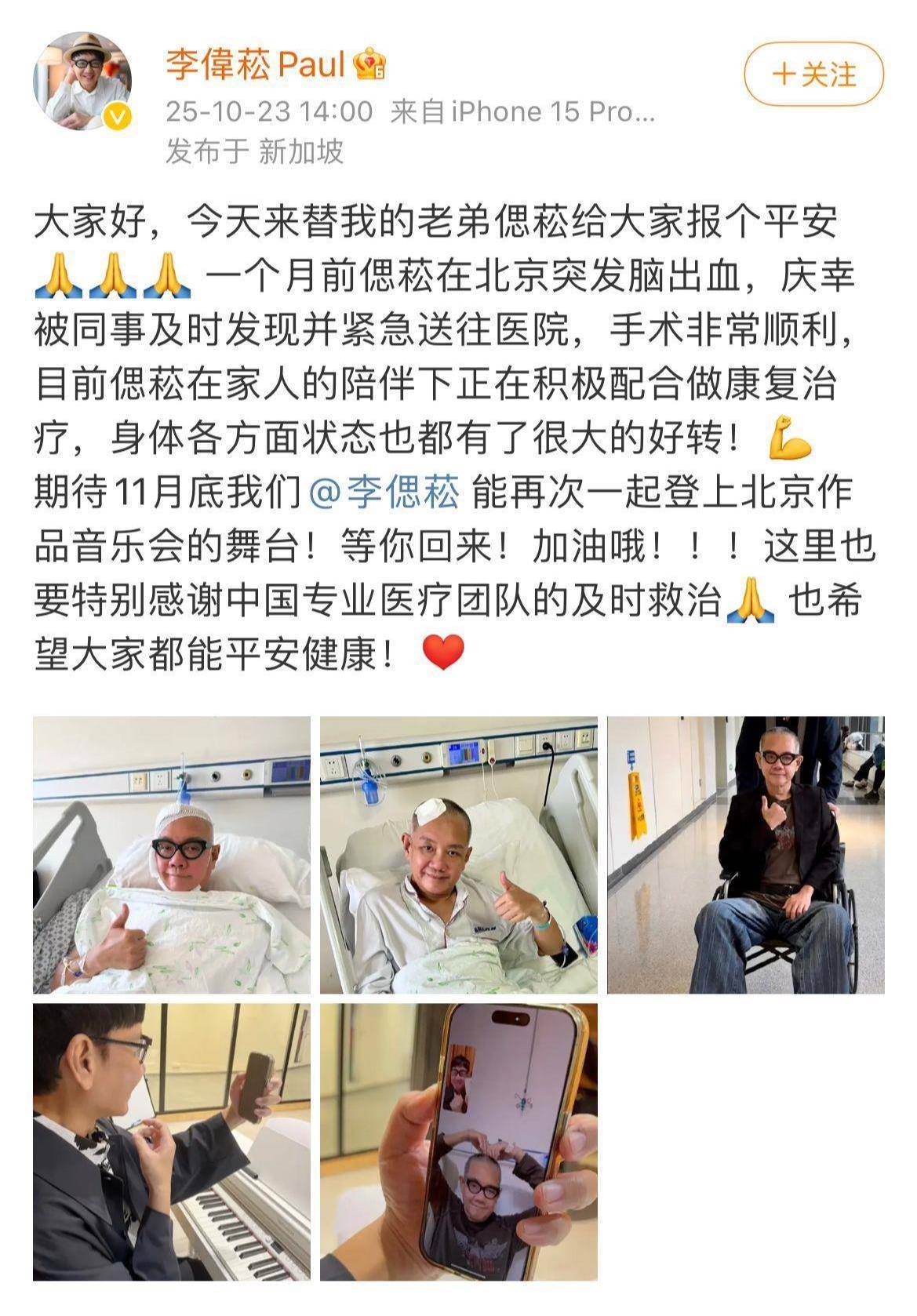 10日下:00,李伟菘发布微博提到,著名音乐人李偲菘一个月前在北京突发脑出血,庆幸被同事及时发现并紧急送往医院,经北京专业医疗团队及时救治身体有了好转。李伟菘在微博中万分感谢“中国专业医疗团队的及时救治”,更祝福所有人平安健康。